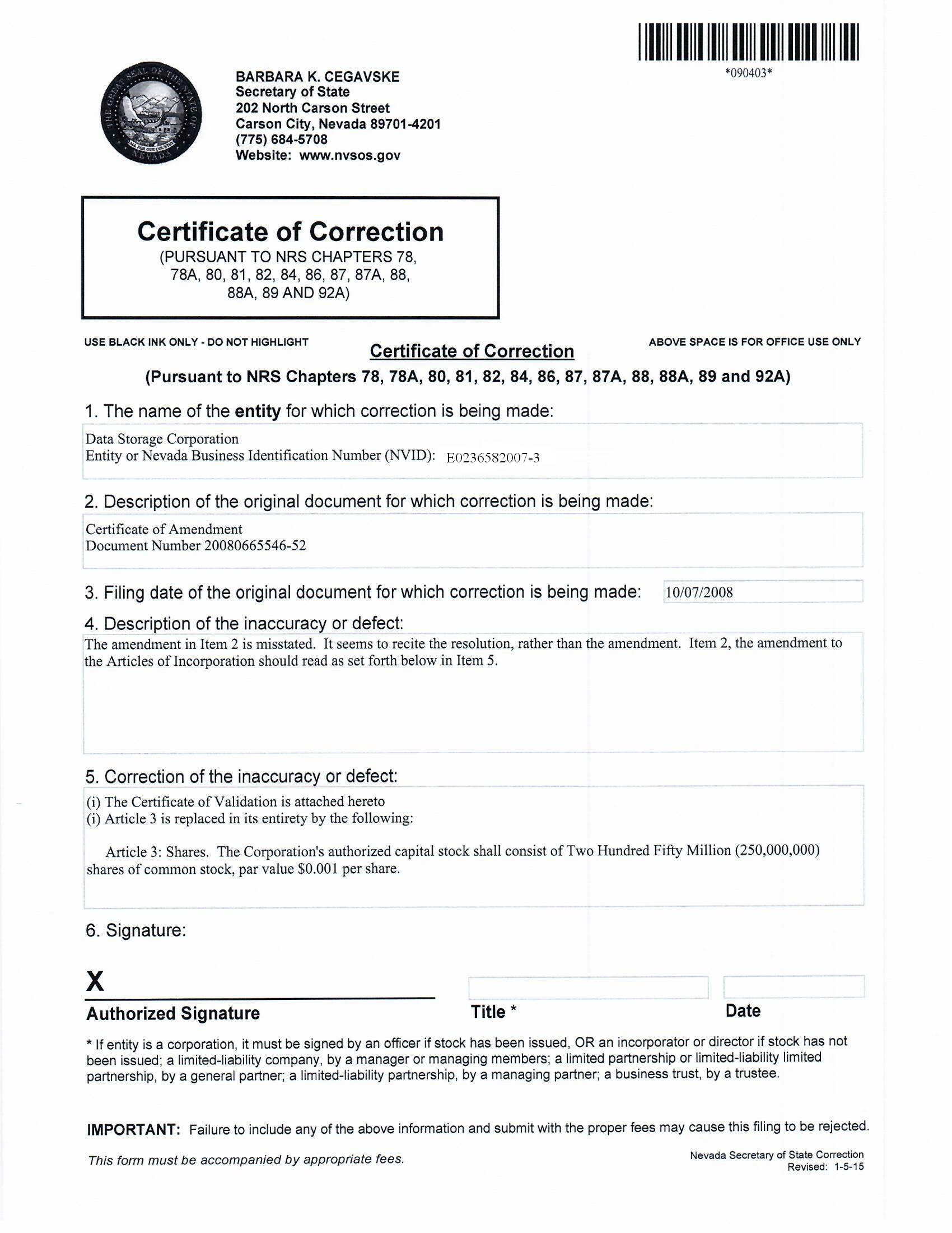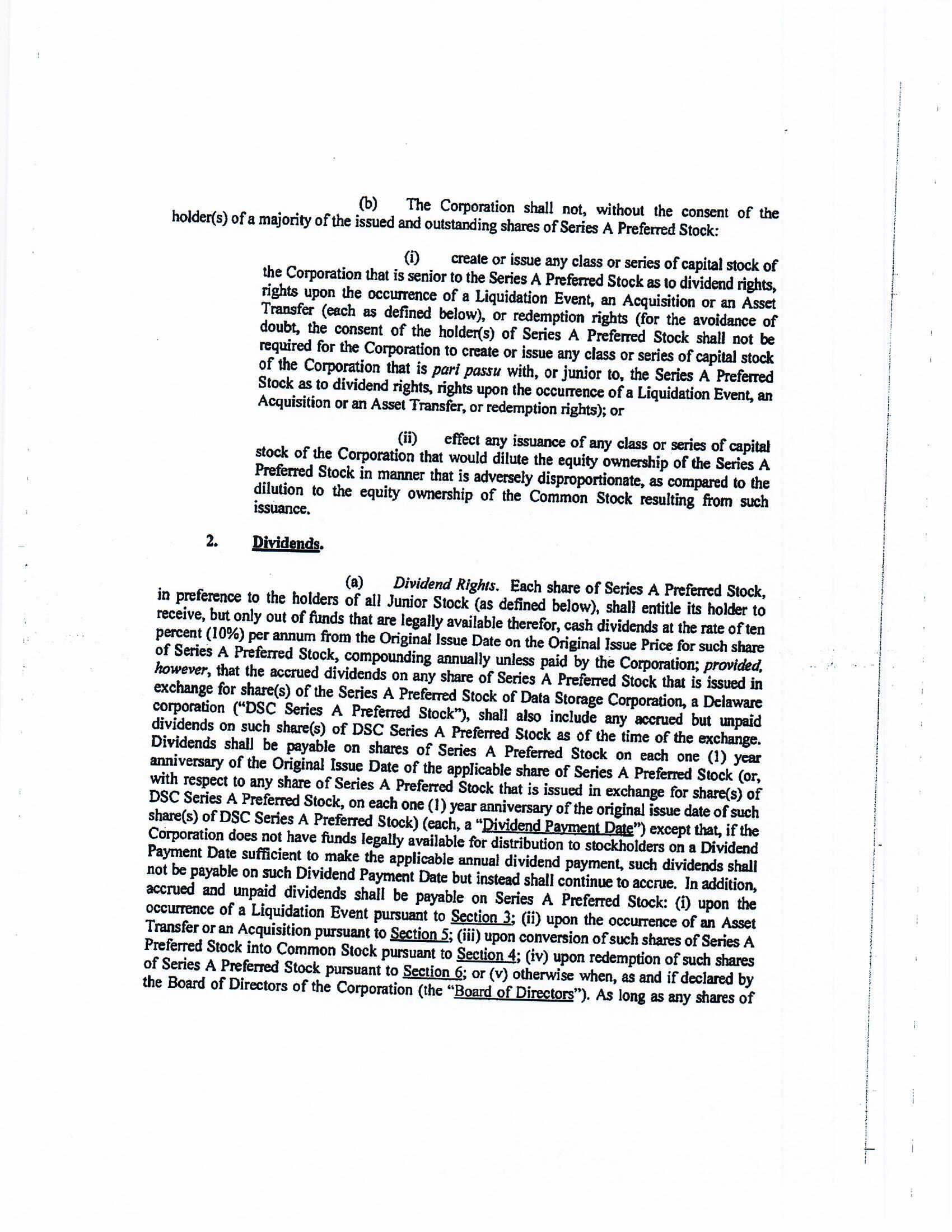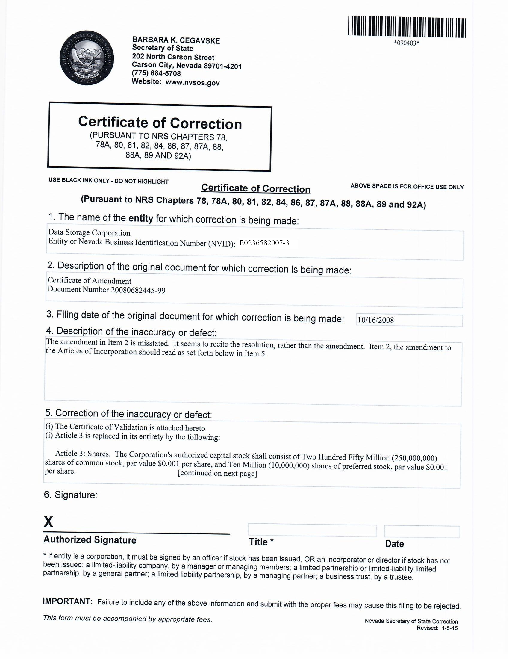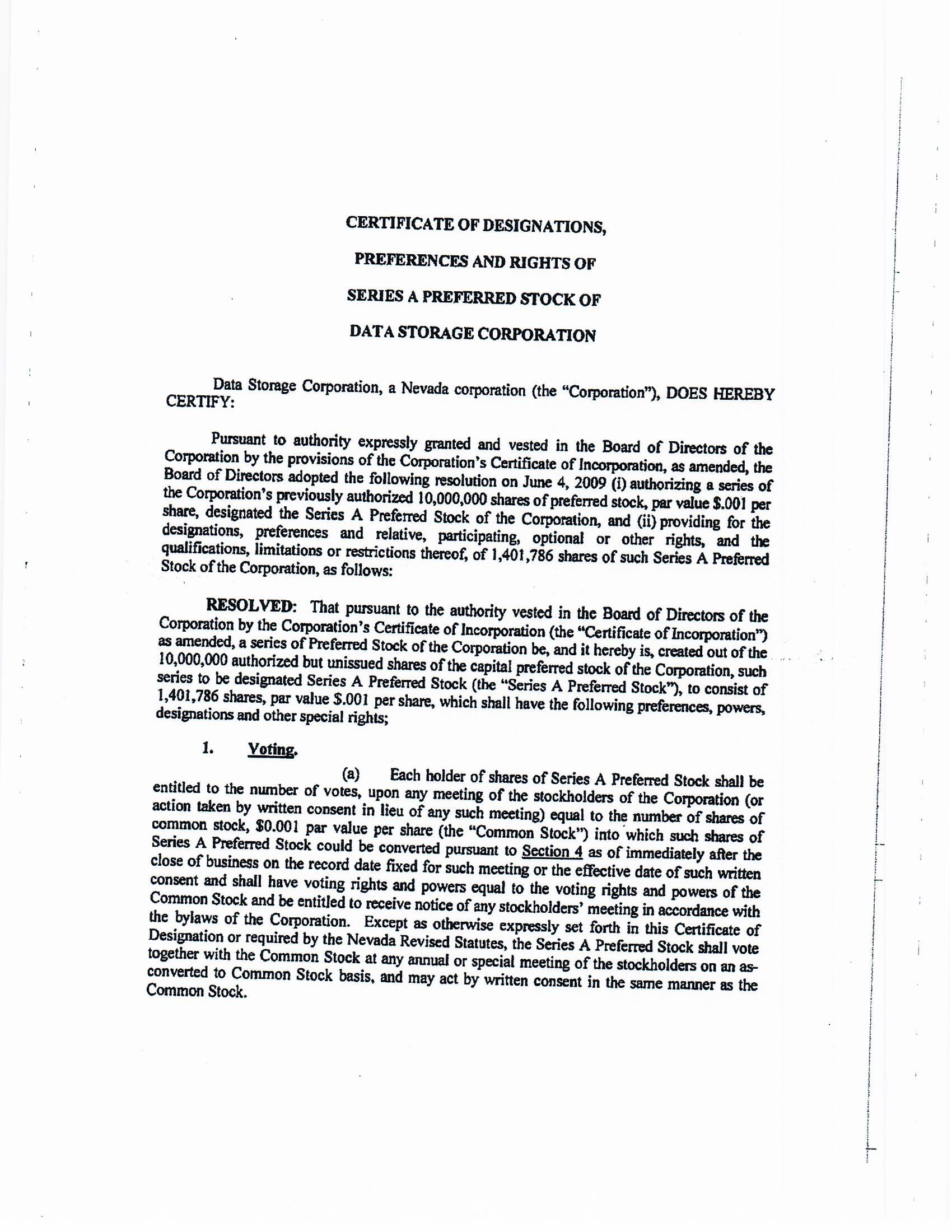 As of the Record Date, Data Storage had 128,539,418 shares of common stock outstanding and 1,401,786 shares of Series A Preferred Stock outstanding. The holders of shares of common stock and Series A Preferred Stock, on a converted to Common Stock basis, are entitled to one vote per share and vote together on all matters to be voted upon by the holder of shares of Common Stock.
