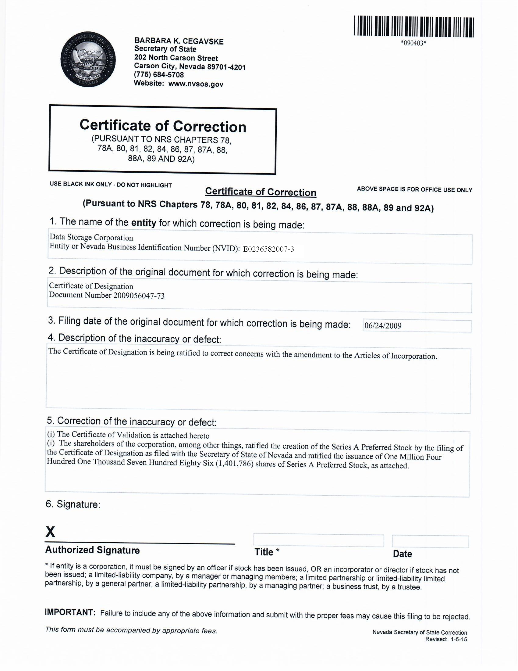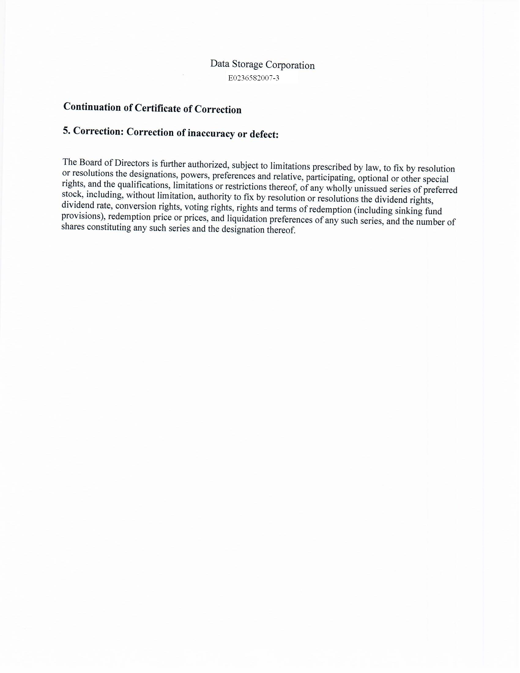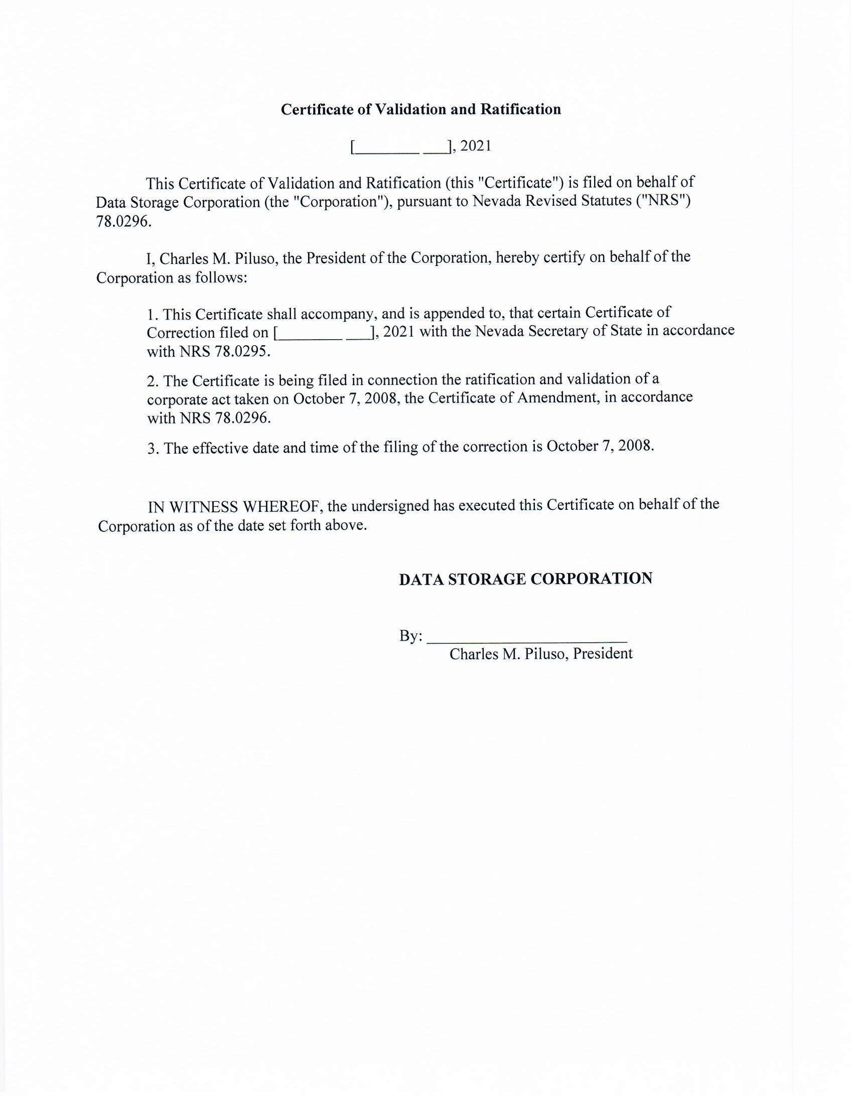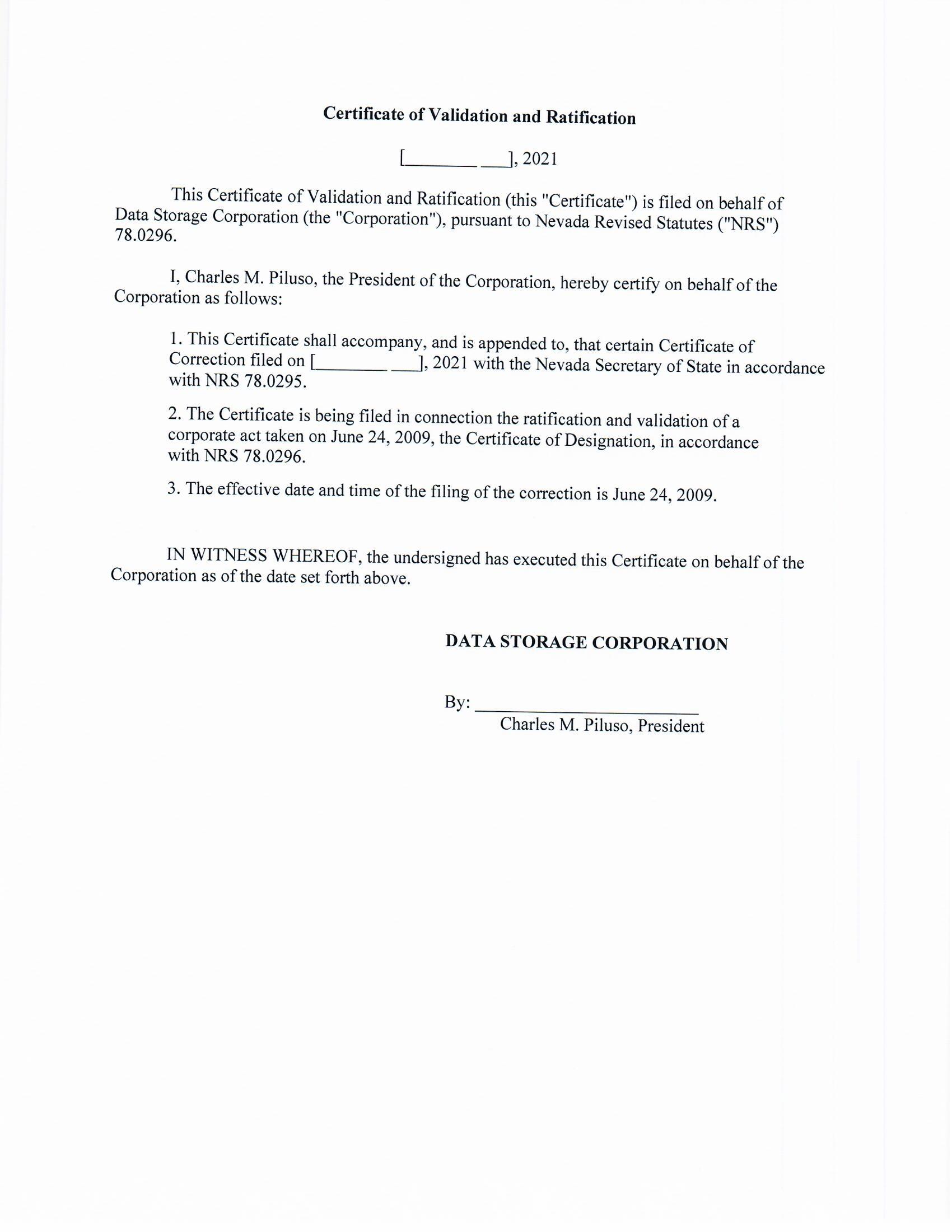 This Information Statement is furnished to the stockholders of Data Storage Corporation., a Nevada corporation (“Data Storage” or the “Company”), in connection with the Company’s receipt of approval by written consent, in lieu of a meeting, on March 8, 2021, from the record holders of an aggregate of 101,553,187 shares of the Company’s common stock, par value $0.001 per share (the “Common Stock”), constituting approximately 78% of the Company’s issued and outstanding voting capital stock (based on 128,539,418 shares of Common Stock and 1,401,786 shares of Series A Preferred Stock, par value $0.001 per share (the “Series A Preferred Stock”) issued and outstanding as of March 8, 2021 therein approving the following actions: