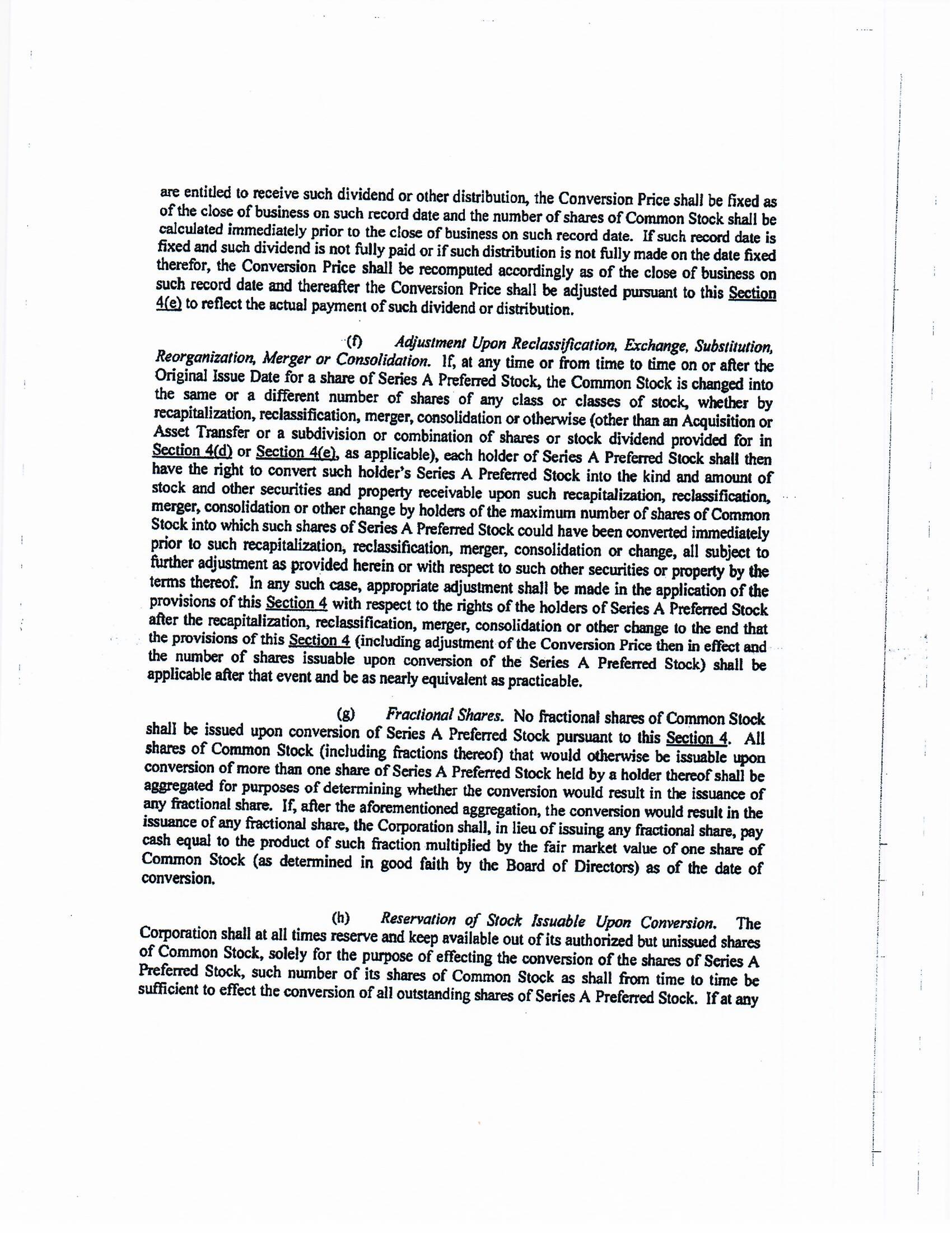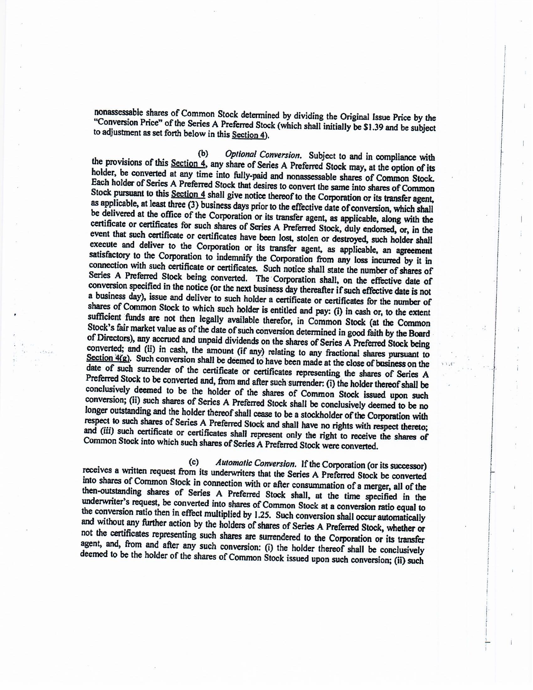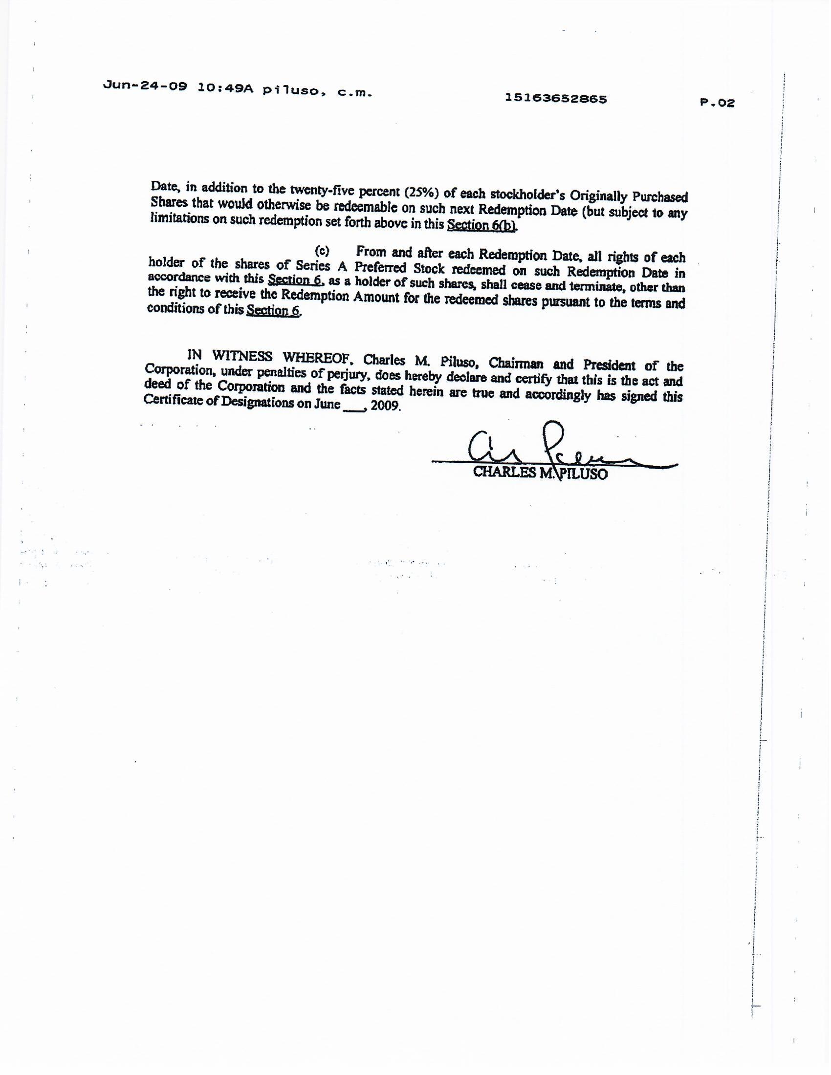 | (6) | Ratification and approval of the Certificate of Designation of the Series A Preferred Stock (the “Certificate of Designation”) filed with the Secretary of State of the State of Nevada on June 24, 2009, the issuance of 1,401,786 shares of Series A Preferred Stock thereunder, and the Certificate of Correction and Certificate of Validation to the Certificate of Designation. |