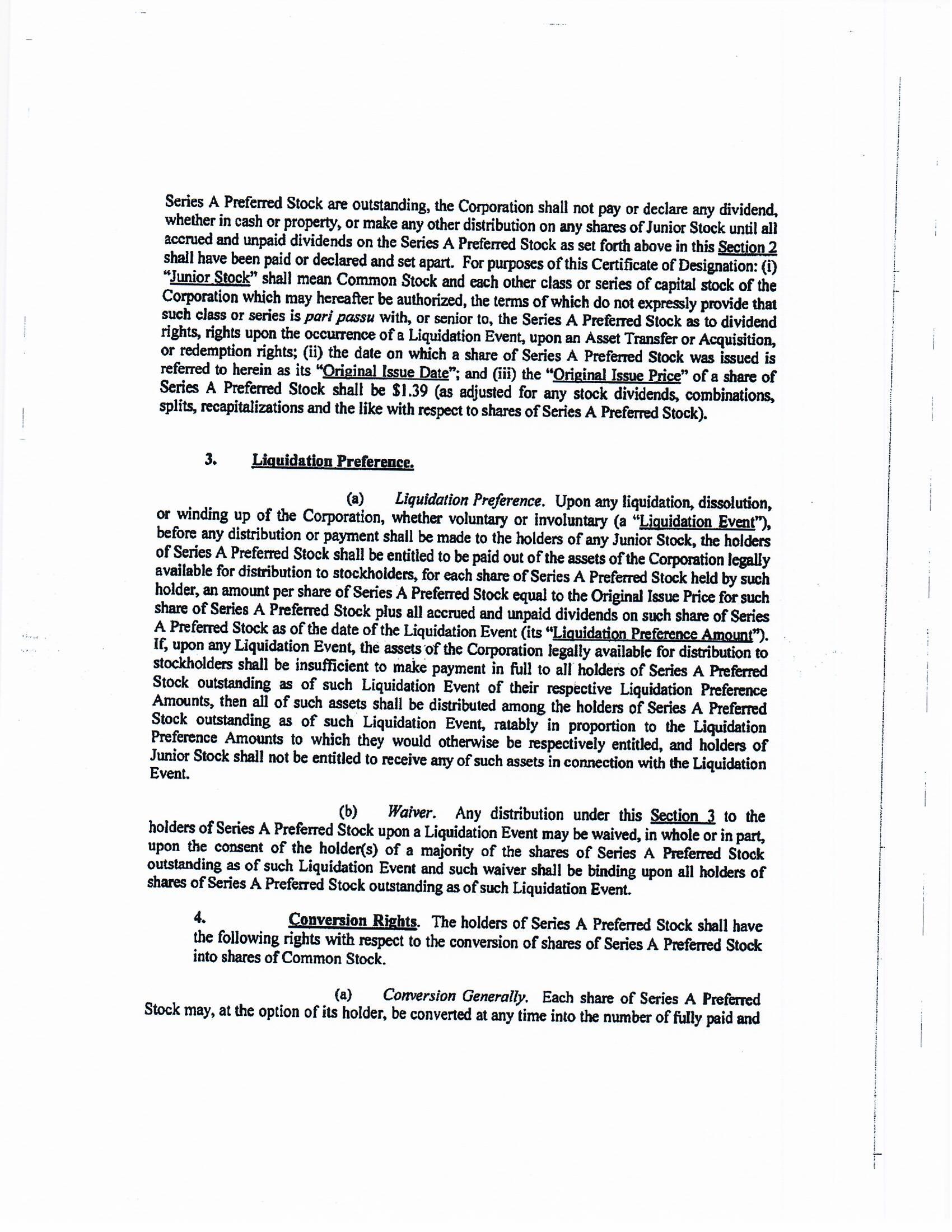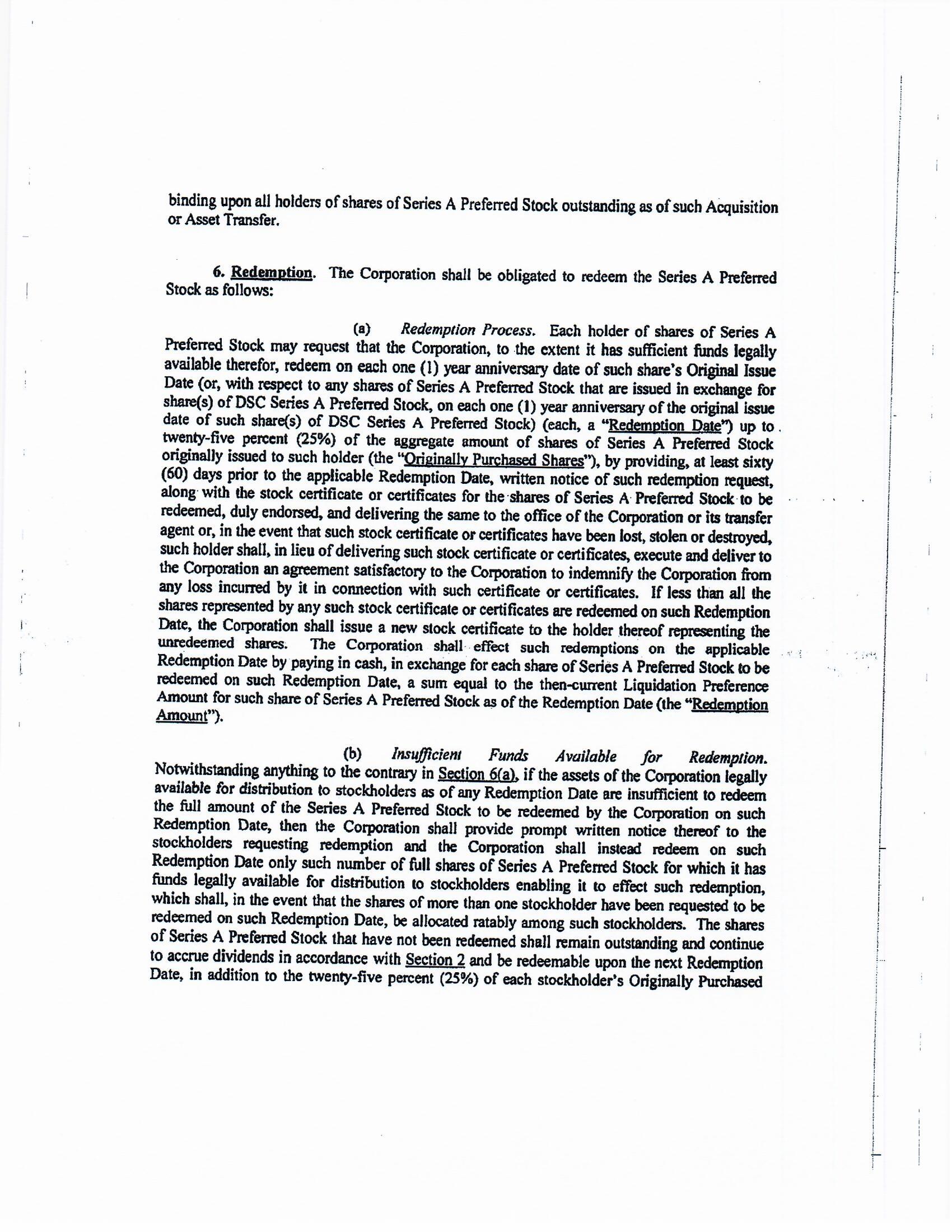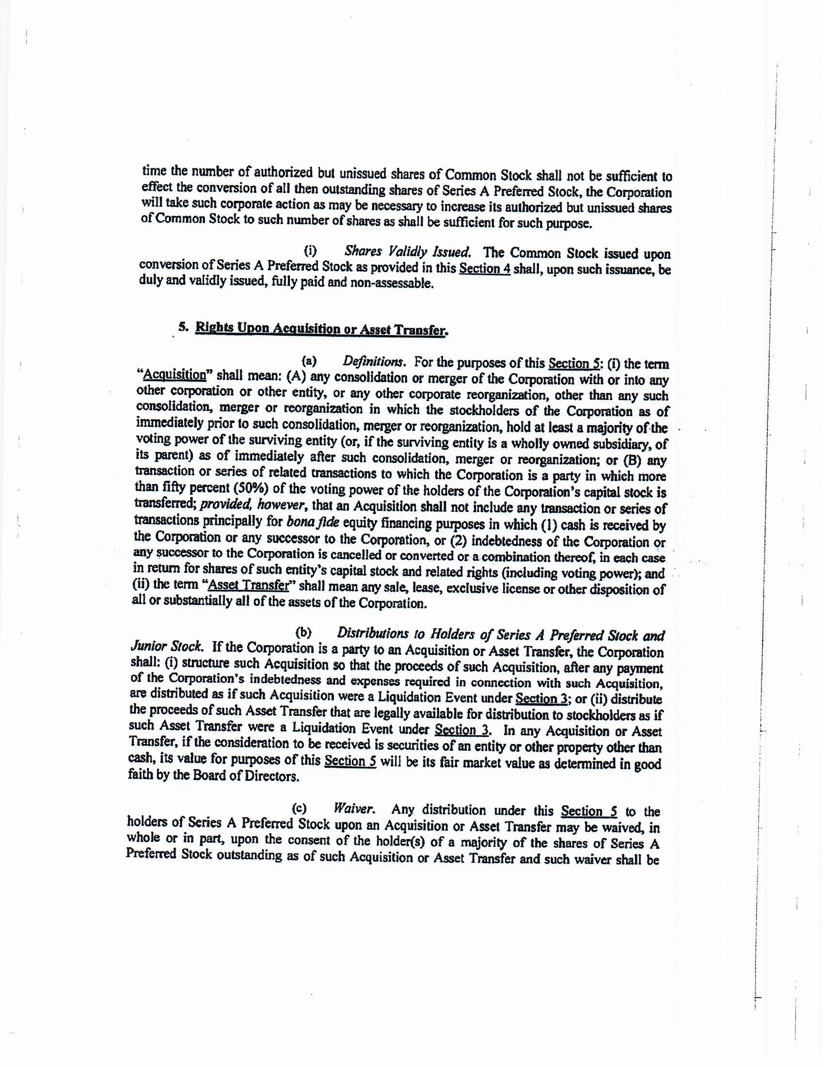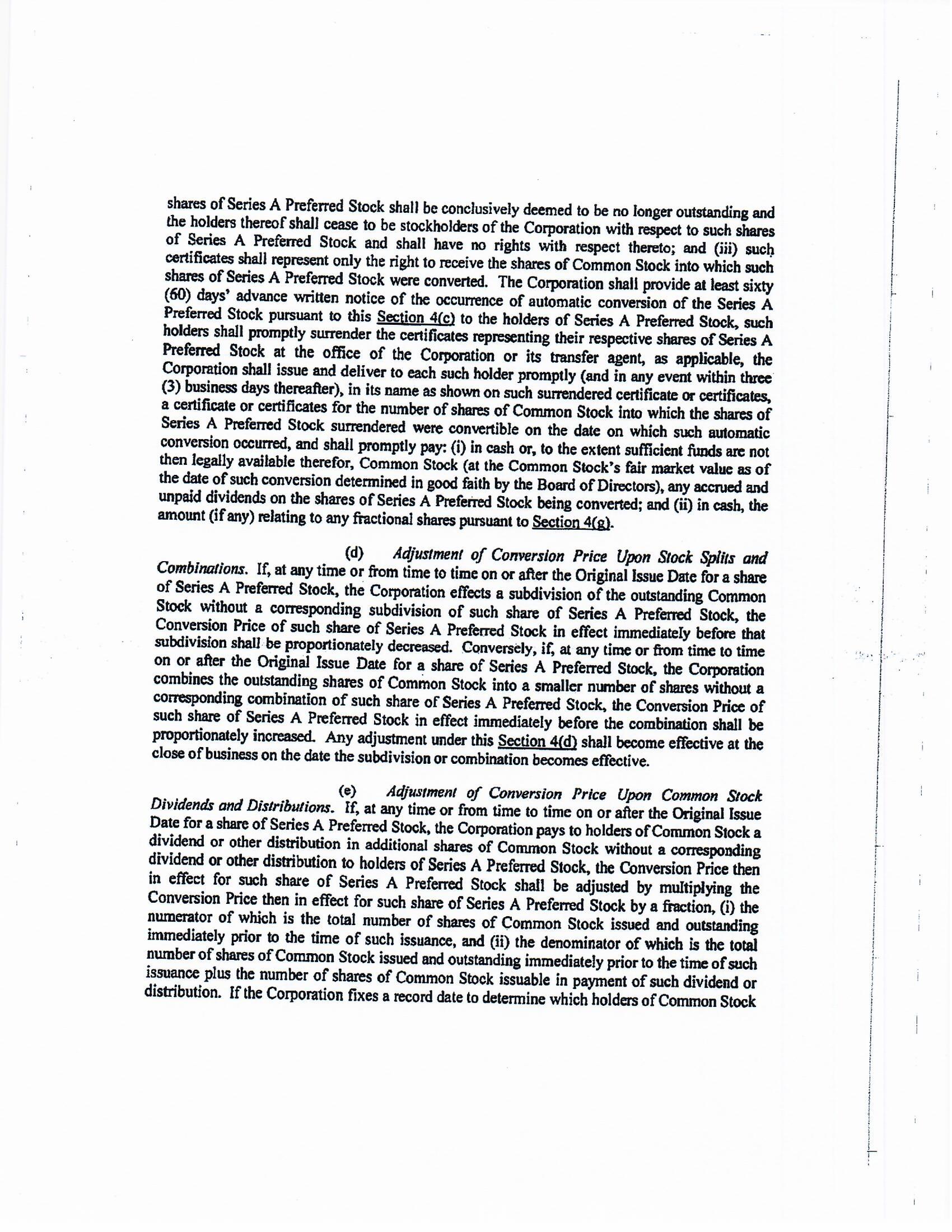 | (6) | Ratification and approval of the Certificate of Designation of the Series A Preferred Stock (the “Certificate of Designation”) filed with the Secretary of State of the State of Nevada on June 24, 2009, the issuance of 1,401,786 shares of Series A Preferred Stock thereunder, and the Certificate of Correction and Certificate of Validation to the Certificate of Designation. |
