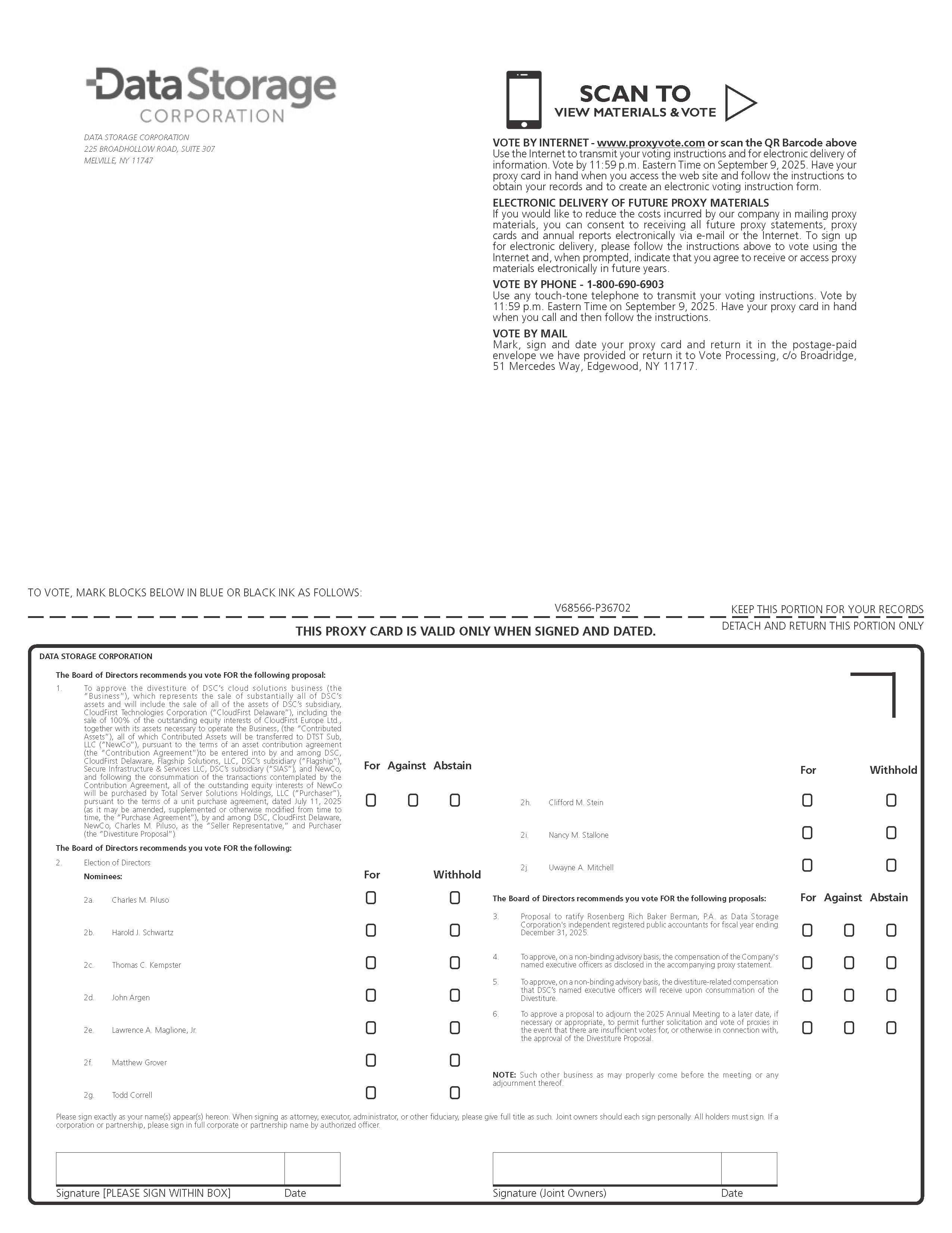 You will be asked to consider and vote FOR the approval of the divestiture of DSC’s cloud solutions business (the “Business”), which represents the sale of substantially all of DSC’s assets and will include the sale of all of the assets of DSC’s subsidiary, CloudFirst Technologies Corporation (“CloudFirst Delaware”), including the sale of 100% of the outstanding equity interests of CloudFirst Europe Ltd. (“CloudFirst Europe”), together with its assets necessary to operate the Business (the “Contributed Assets”), all of which Contributed Assets will be transferred to DTST Sub, LLC (“NewCo”) pursuant to the terms of an asset contribution agreement (the “Contribution Agreement”) to be entered into by and among DSC, CloudFirst Delaware, Flagship Solutions, LLC, DSC’s subsidiary (“Flagship”), Secure Infrastructure & Services LLC, DSC’s subsidiary (“SIAS”), and NewCo, and following the consummation of the transactions contemplated by the Contribution Agreement, all of the outstanding equity interests of NewCo (the “NewCo Units”) will be purchased by Total Server Solutions Holdings, LLC (“Purchaser”), pursuant to the terms of a unit purchase agreement, dated July 11, 2025 (as may be amended, supplemented, or otherwise modified from time to time, the “Purchase Agreement”), by and among DSC, CloudFirst Delaware, NewCo, Charles M. Piluso, as the “Seller Representative,” and Purchaser (the “Divestiture”). This proposal is referred to as the “Divestiture Proposal.”